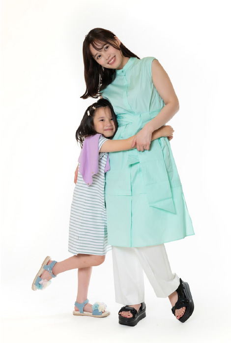 キッズコーデのポイントはサンダル。娘も、見つけた瞬間「かわいい♡」と大喜び。 親子できれい色をさりげなく取り入れてリンクさせて、お揃い感のあるコーデが完成!