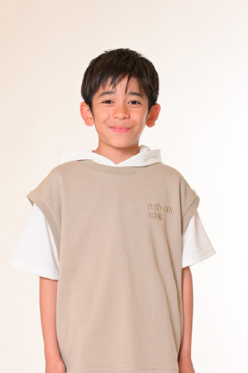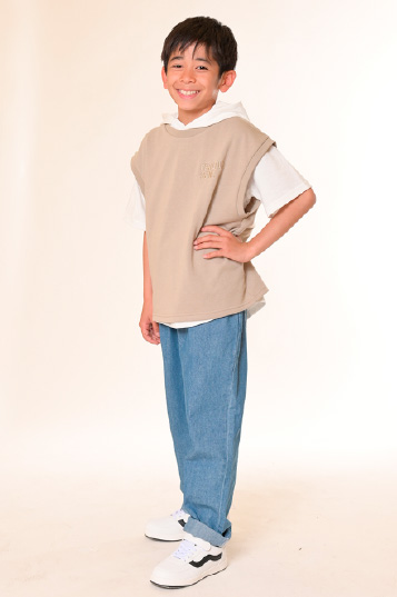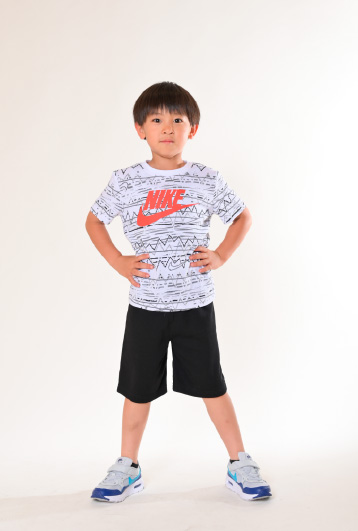 キッズはエッジの効いたプリントデザインのTシャツに、ワンポイントロゴのハーフパンツを合わせたクールなコーディネート。さらりとした肌触りで着心地も◎。