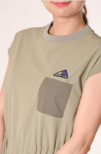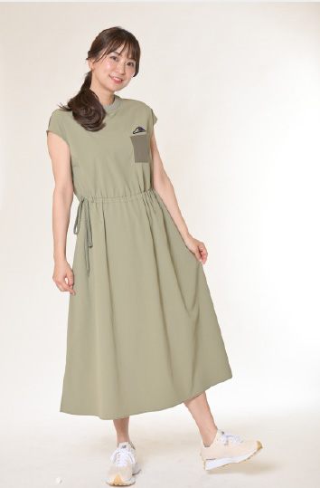 ママは、ほどよいリラックス感のフレンチスリーブワンピース。撥水、防風性を備えつつ屋内外で使える機能性とカジュアル感が魅力。ライトハイクやキャンプなどのアウトドアシーンからトラベルまで幅広く活躍すること間違いなし!
