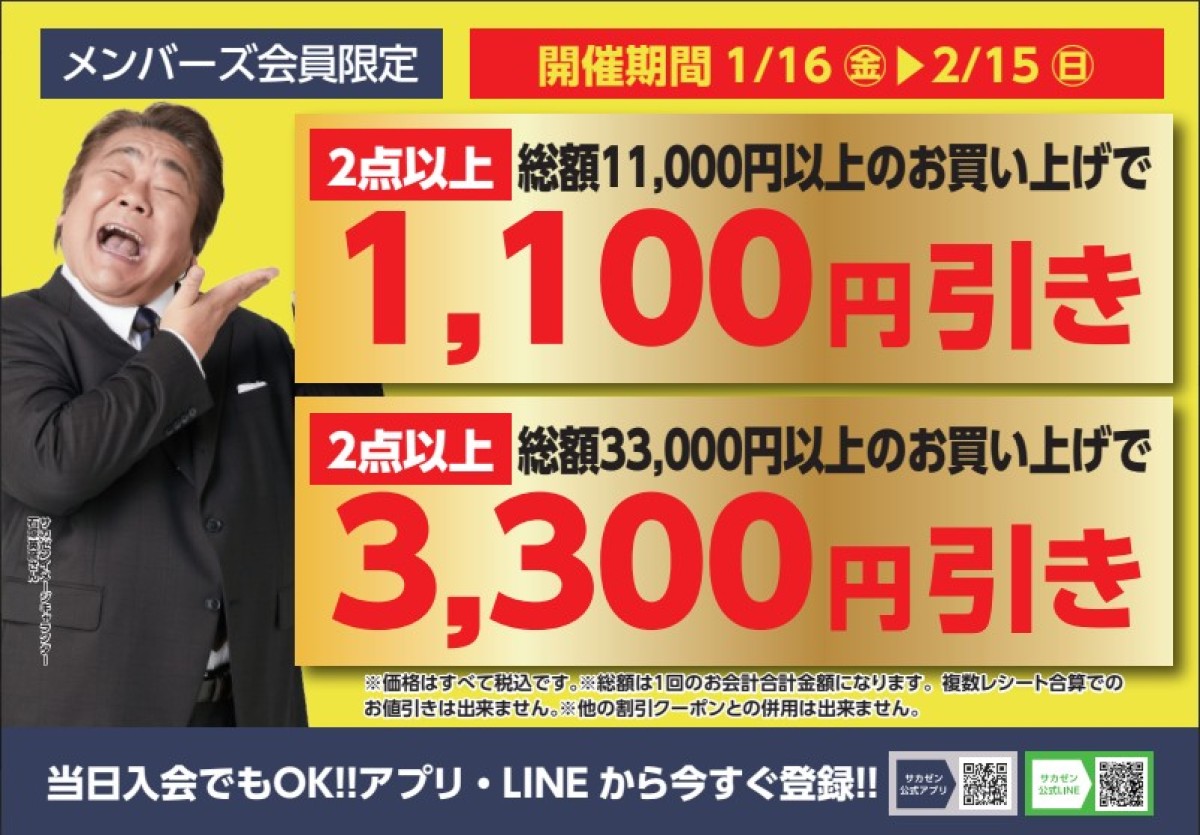 ※サカゼンメンバーズ会員様限定となります(当日入会可) ※価格は税込みです ※総額は1回のお会計合計金額になります、複数レシート合算でのお値引きは出来ません ※他の割引クーポンとの併用は出来ません