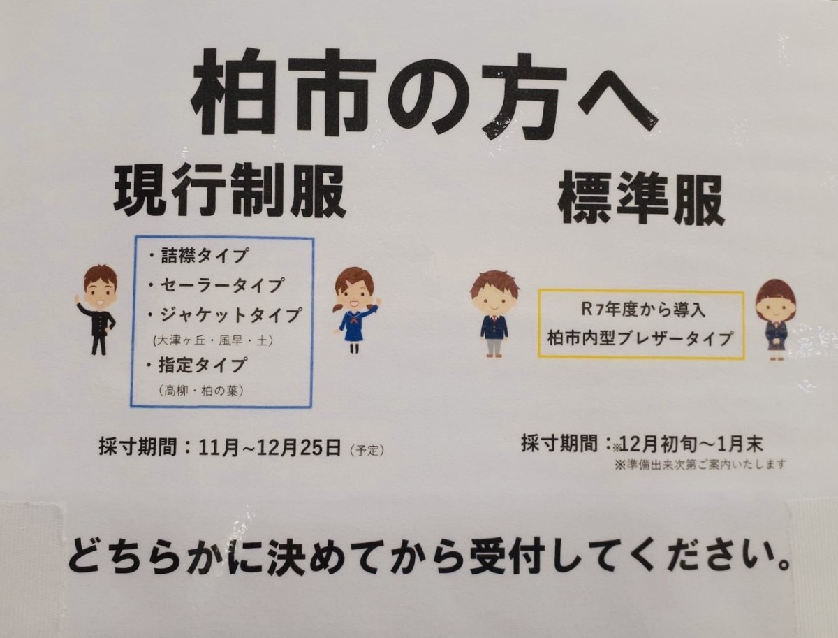 久寺家中、白山中、八木中、柏市の中学校で現行制服をご希望の方11月がオススメです!
