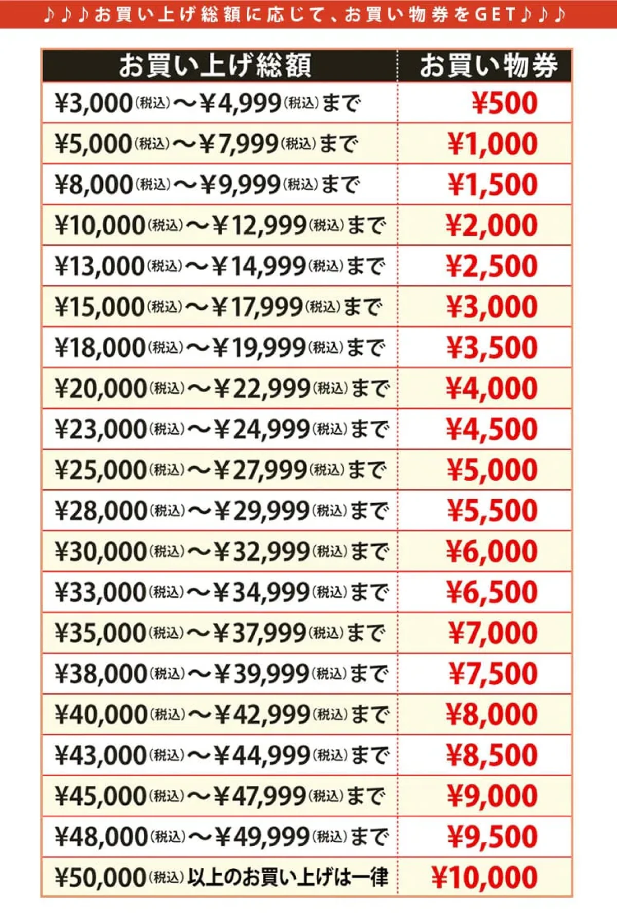 さらに5000円以上のお買上げでお買物券が1000分と購入金額に応じてお買物券の金額もアップ!
