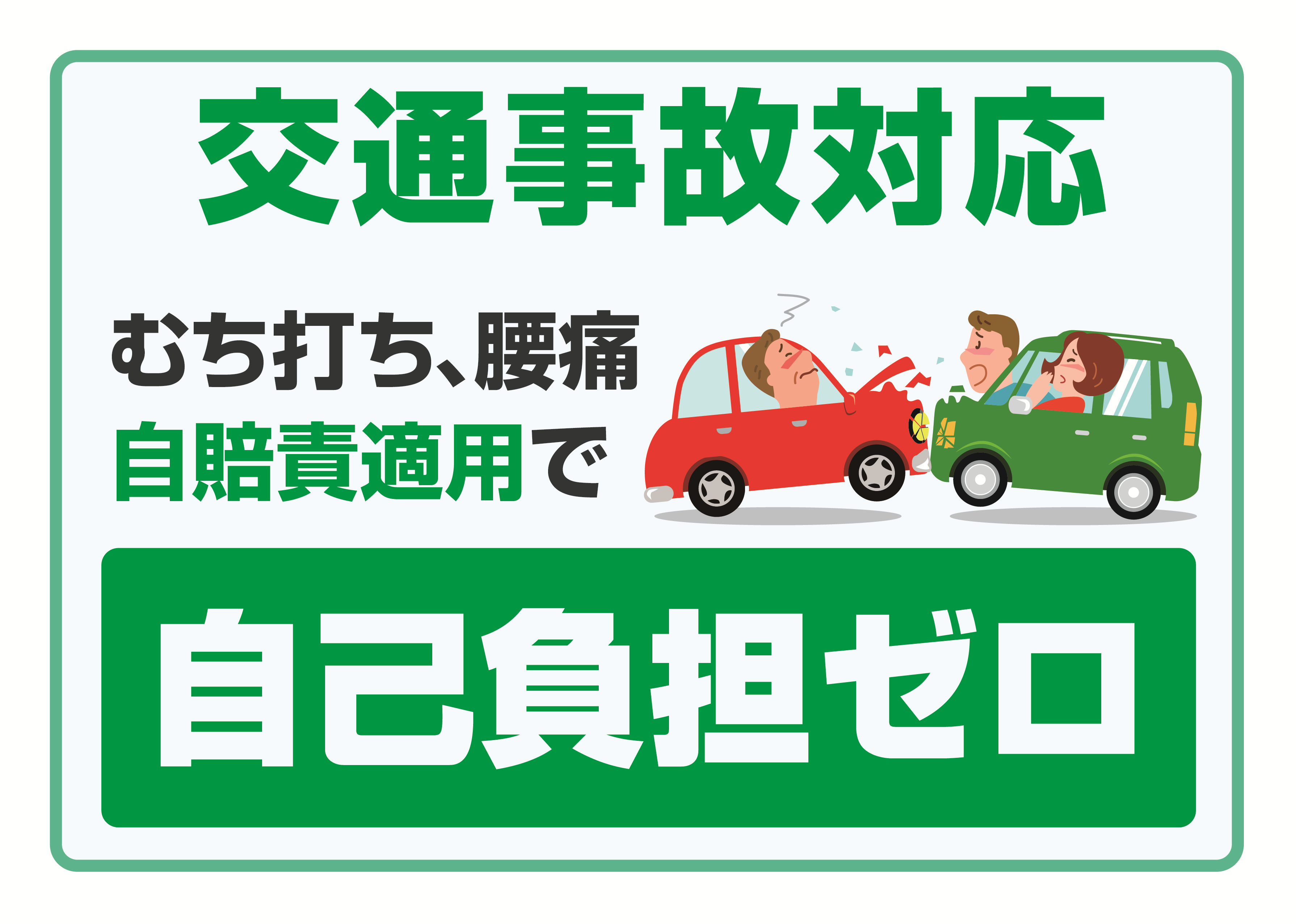 交通事故のむち打ち(自賠責保険適用で自己負担なし)や、