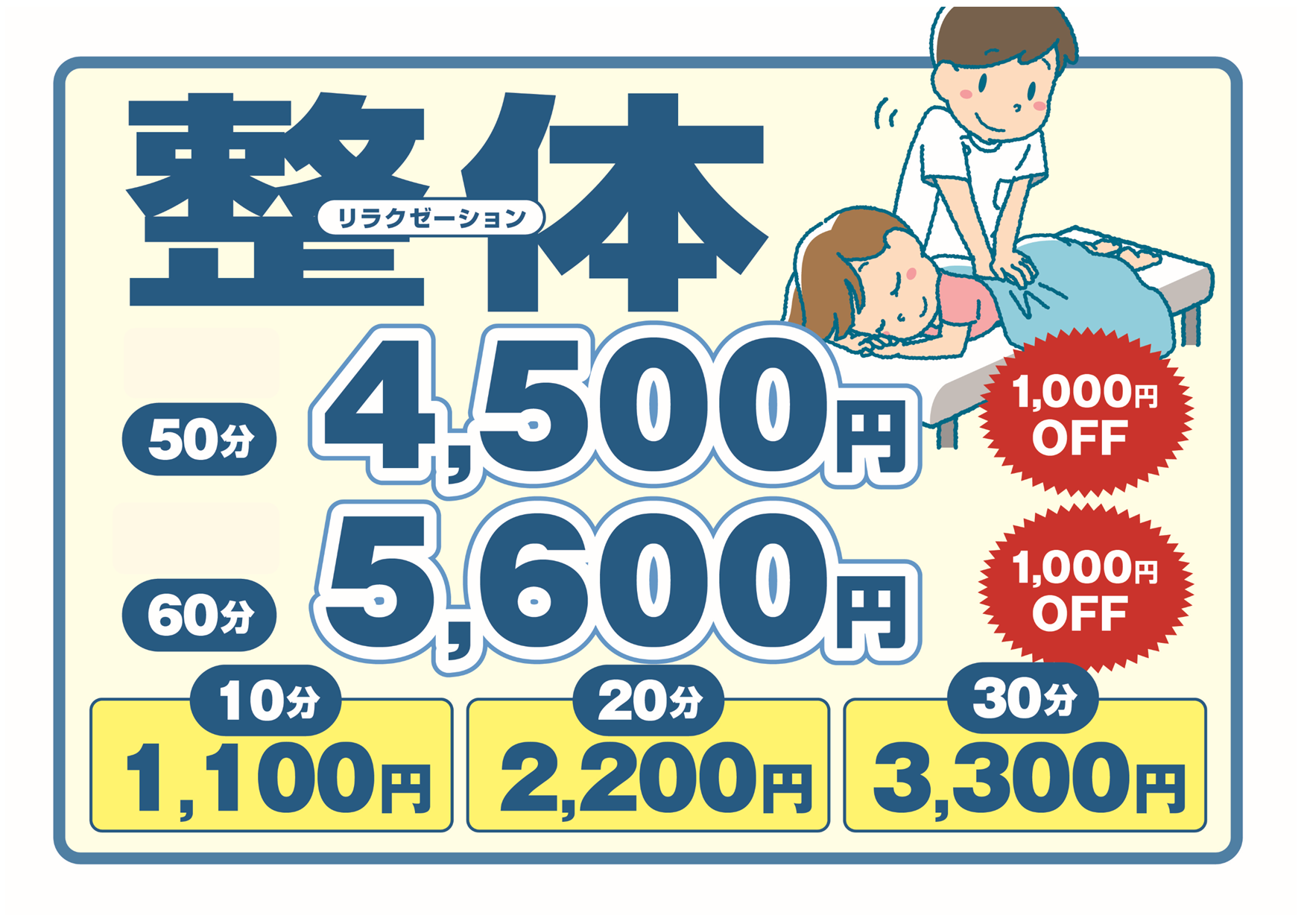 | 取扱商品 | 交通事故治療(むち打ち)・整骨・整体・リラクゼーション他 |